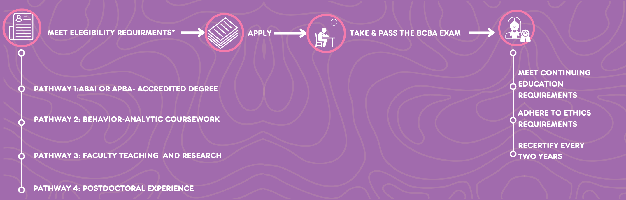 To become a Board Certified Behavior Analyst (BCBA), you must obtain a qualifying master’s degree from an accredited program, complete a qualifying course sequence, 2000 supervised fieldwork hours (or 1500 concentrated fieldwork hours), and pass the BACB’s board exam. More resources are linked below.