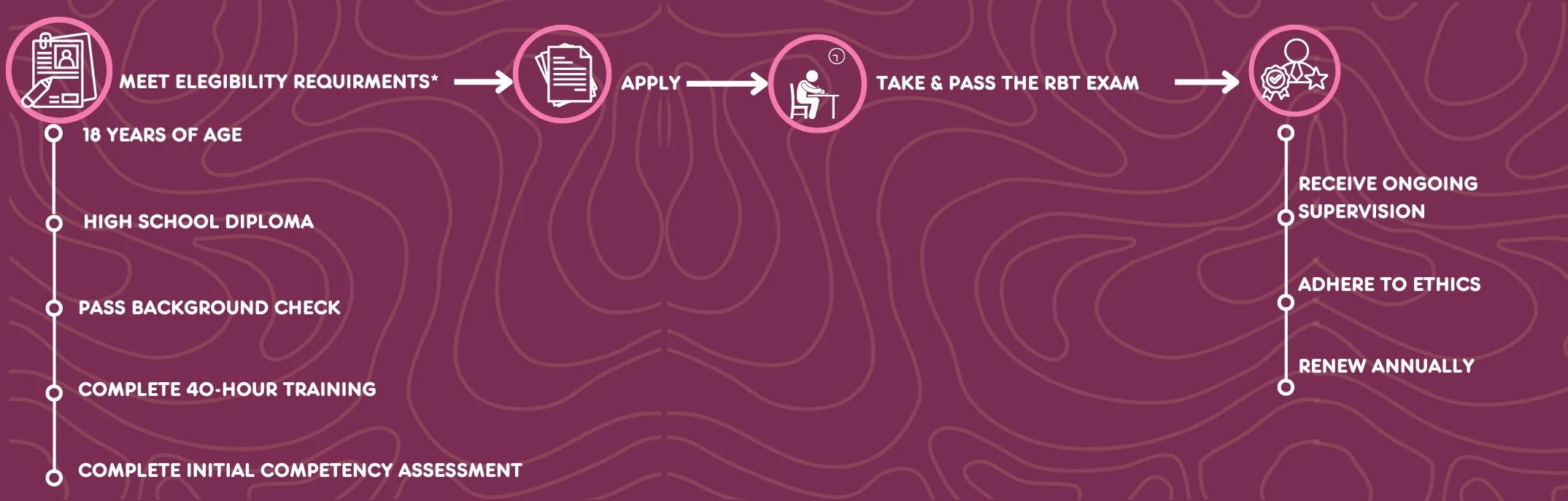 To become a Registered Behavior Technician (RBT), you are required to be 18 years of age with a High School diploma or GED, complete a BACB accredited 40-hour course, pass a competency assessment performed by a BCBA, and pass the BACB’s board exam. More resources are linked below.